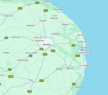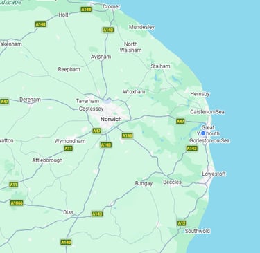 From Norwich, Great Yarmouth and Cromer to Lowestoft, Beccles, Bungay, Diss and the surrounding towns and villages — if you’re within the area shown on the map, we’ve got you covered.
